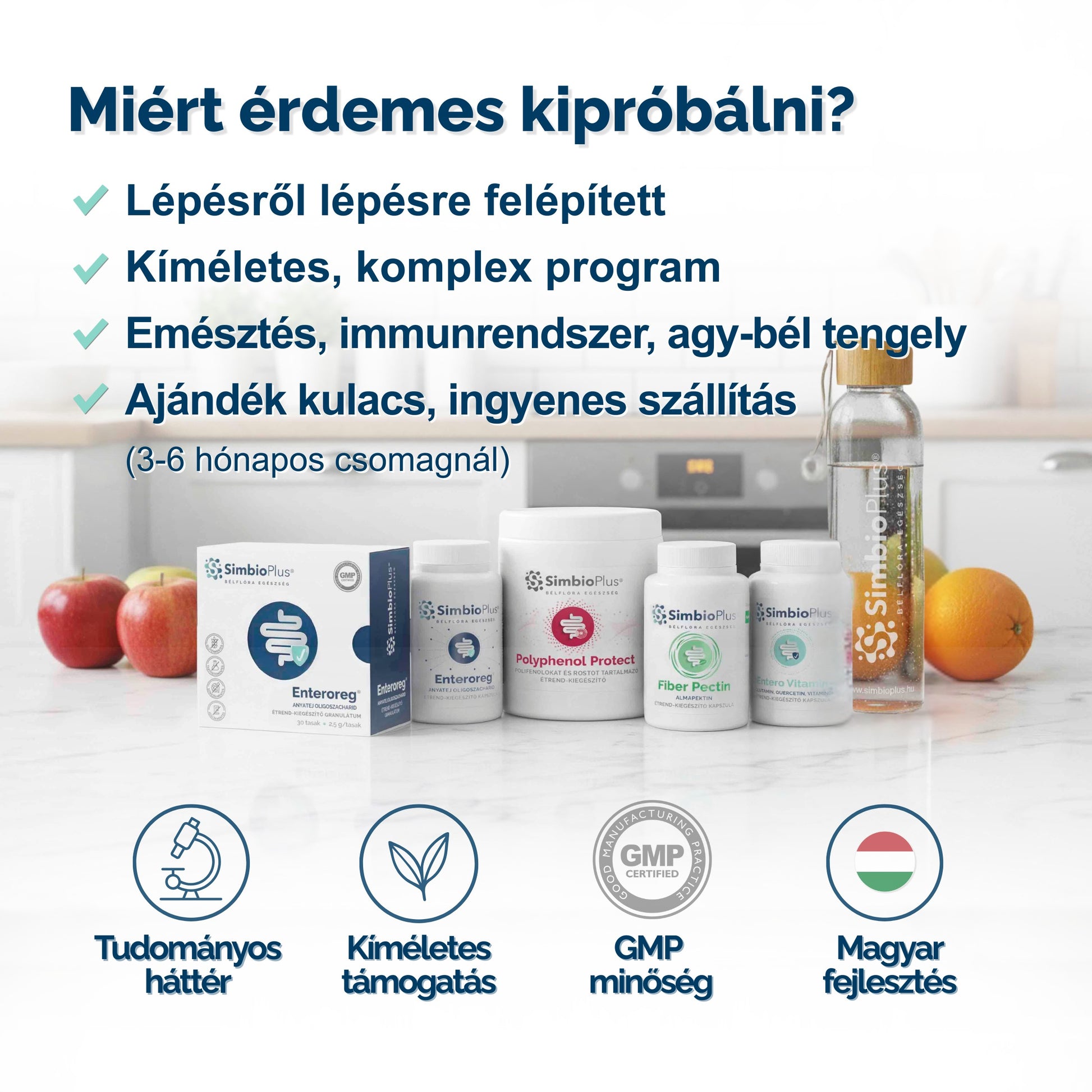 - +1, Opcionálisan kiegészíthető az Entero Vitaminnal, a bél- és immunrendszer mikrotápanyag-igényének támogatására.