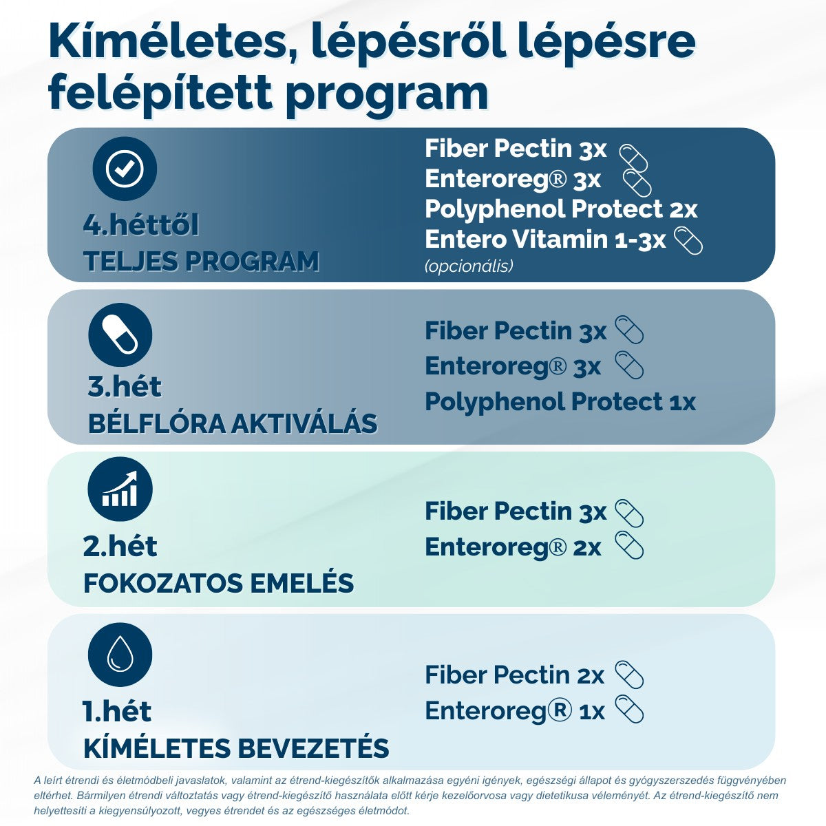 A program fokozatos bevezetéssel javasolt: először a Fiber Pectin, majd az Enteroreg®, végül a Polyphenol Protect következik.