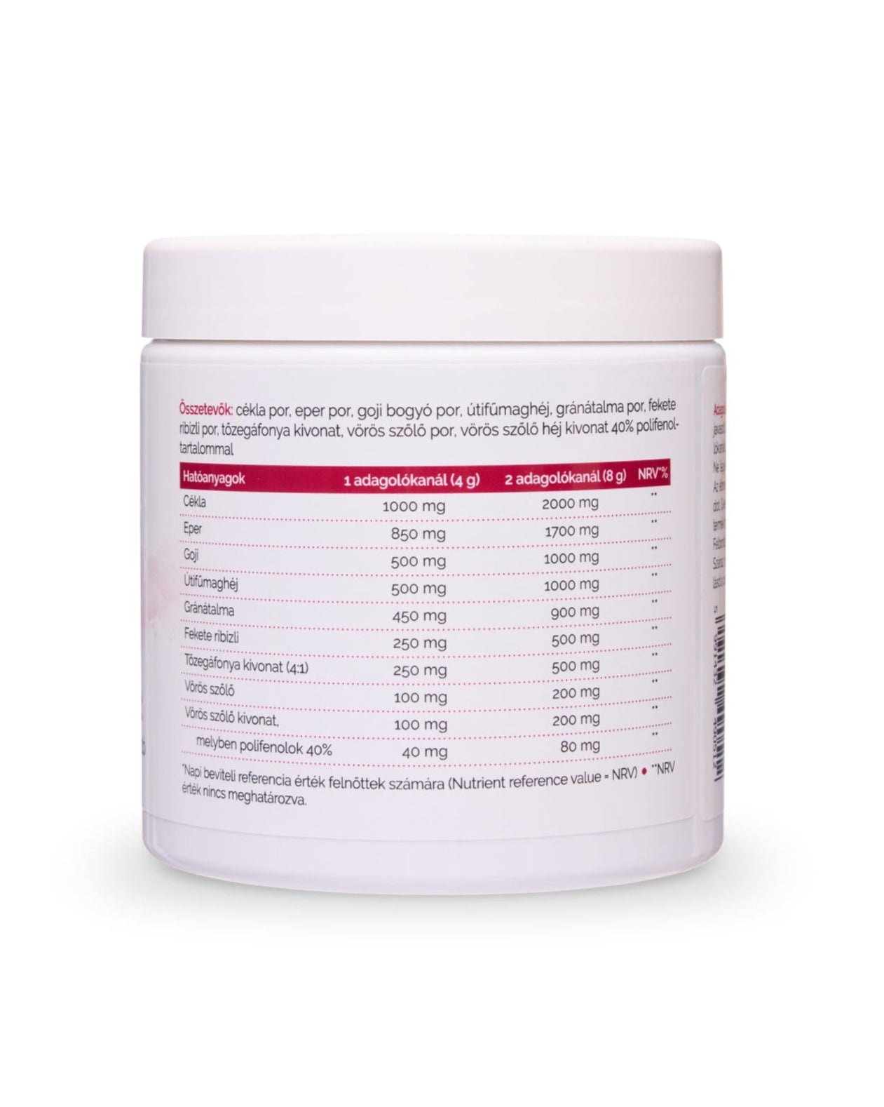 Ez a készítmény nemcsak prebiotikus rostokat tartalmaz, hanem válogatott polifenolokat is (pl. gránátalma, goji, fekete ribizli), így komplex módon támogatja a bélflórát és a sejtvédelmet is.
